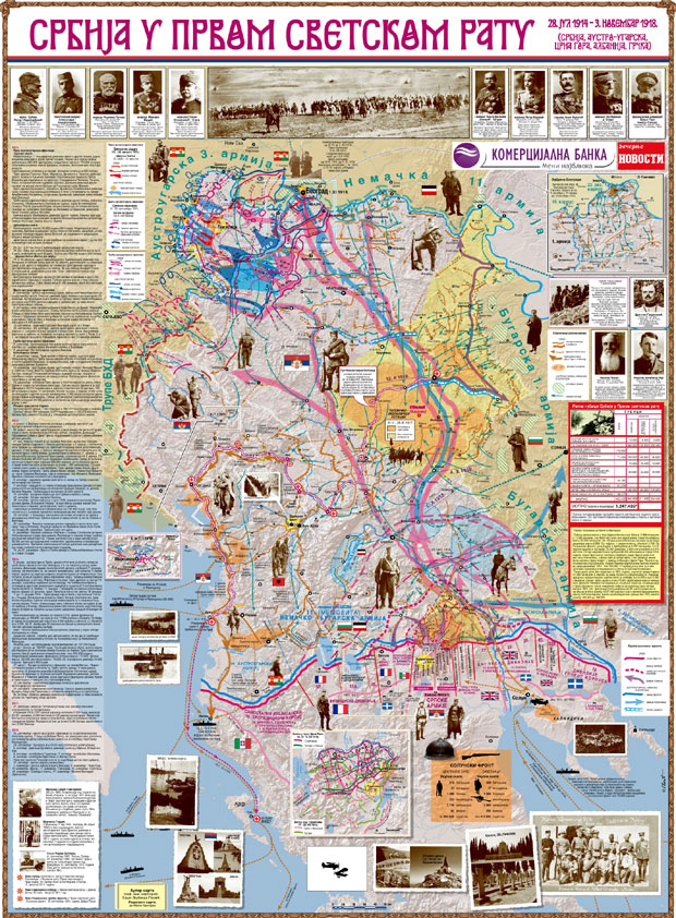 Sa leve strane, po dužini cele mape, pruža se istorijat austrijskih ofanziva i navećih bitaka, koje su slikovito prikazane i na samoj mapi. U momentu početka Prve austrijske ofanzive, Srbija je imala 280.000 operativnih vojnika i 170.000 ostalih obveznika, kao i 500 topova. Bila je sastavljena iz Prve, Druge i Treće armije, i Užičke vojske. Crnogorska vojska mobilisala je 35.000 vojnika, u šest divizija, i imala je 65 topova.