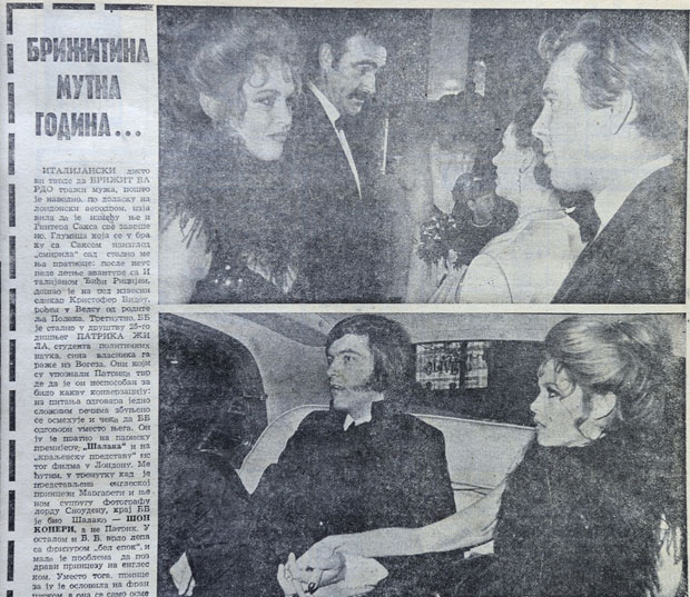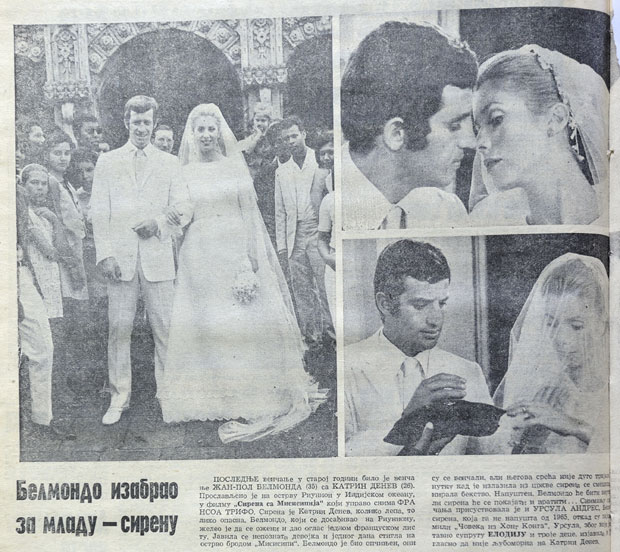 U isto vreme, kao poslednji "svetski" događaj u protekloj, 1968. godini, istaknuto je venčanje Žan-Pola Belmonda (35) i Katrin Denev (26). Svetski mediji su brinuli i o megazvezdi Brižit Bardo, koja je "završila vezu sa Ginterom Saksom", a pred novogodišnju noć viđena je na jednom aerodromu sa Šonom Konerijem.