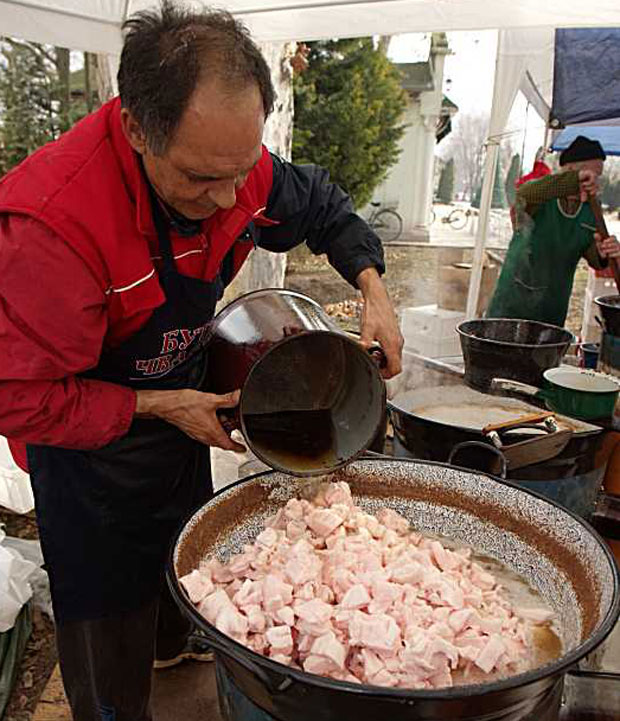 U hali i na platou sve se šarenilo od raznih mesnih proizvoda. Širili se mirisi tek ispečenih čvaraka i prženja svežih kobasica, roštilja i prasića na ražnju.