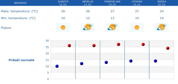 Jutarnja temperatura biće od pet do 10 stepeni, a najviša dnevna od 25 do 27 stepeni, samo u Negotinskoj Krajini oko 22 stepena.