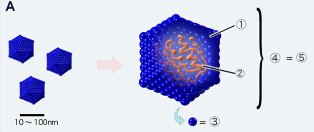 Slika A - Virusnu česticu (5) čini nukleokapsida (4) koja se sastoji od (1) kapside, odnosno proteinske ljuske koja obavija i štiti genetski materijal virusa od delovanja enzima ćelije domaćina. Kapsida je građena od podjedinica, tzv. kapsomera (3) i nosilac je virusnih antigena po kojima obrambeni mehanizam prepoznaje viruse i reaguje na njih napadom. U kapsidi se nalazi genetski materijal virusa, odnosno nukleinska kiselina koja sadrži uputstva potrebna za umnožavanje virusa. Kod nekih virusa to je dvostruka DNK, a kod nekih jednostruka RNK. U slučaju korona virusa 2019 n-CoV, to je RNK.