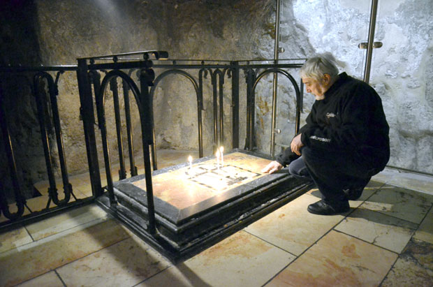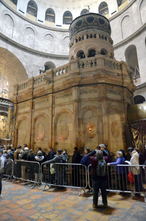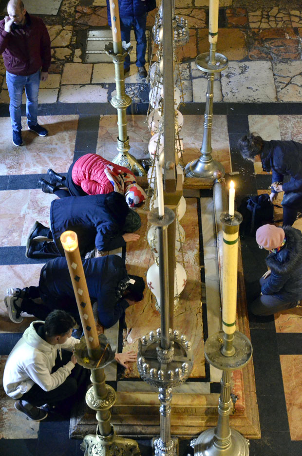 Iz nje se ulazi u sledeću minijaturnu odaju, srce hrišćanske tajne, pećinu u kojoj je tri dana počivao Hrist. Samo što pećina više nije pećina već kockasta kapelica obložena hladnim mermerom. Pravougaoni mermerni sanduk kraj zida pokriva mesto gde je, kažu, ležao Isus. Poklonici natiskani kao sardine kleče i stavljaju čela na taj kamen, brzo izgovarajući molitve jer ih monah požuruje. Tako je do četiri po podne kada službenici hrama s mukom potiskuju hodočasnike do ulaza crkve da bi sveštenici i monasi hrišćanskih crkava po utvrđenom redu mogli da obavljaju bogosluženja.