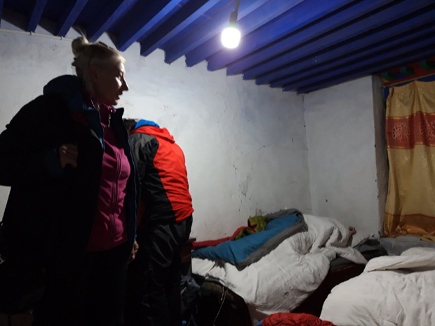 Put je strašno naporan, jer su prostranstva ogromna, a nadmorska visina velika. Posle Lase sledeća tačka aklimatizacije je bazni kamp za alpiniste koji idu na Mont Everest. Spava se u betonskom objektu na 5.200 metara bez vrata, a hodočasnici su pokriveni sa tri jorgana i obučeni u jakne sa kapama i rukavicama.
