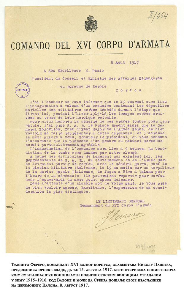 Ferero obaveštava Pašića da će 15. avgusta 1917. godine biti otkrivena spomen-ploča koju su italijanske vojne vlasti podigle srpskim vojnicima stradalim u zimu 1915-1916. godine kod Valone.