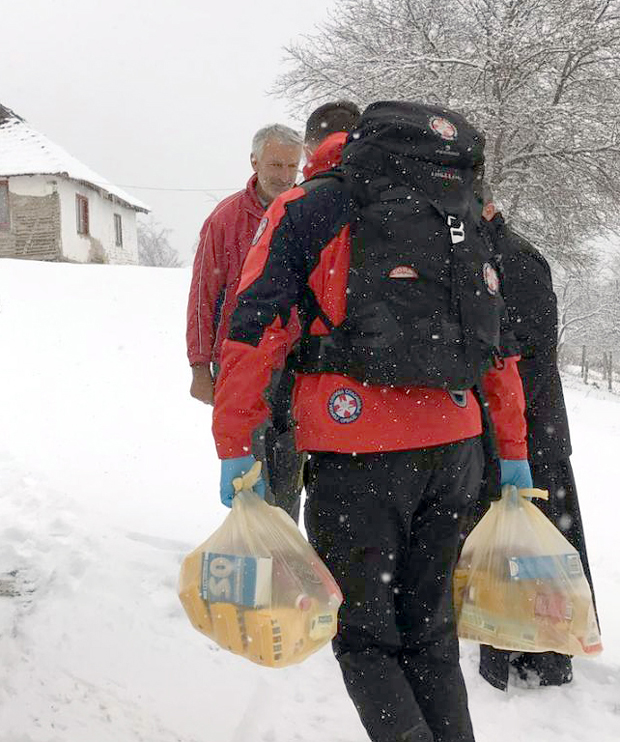 ZBOG teškog i razuđenog terena spasioci su morali da se podele u dve ekipe da bi na leđima doneli humantarne pakete i neophodne lekove selima na planinama Goliji, Rogozni i Mokroj.