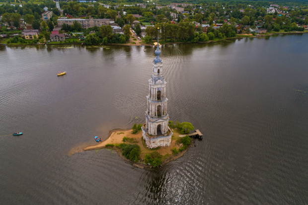 Oko 200 kilometara severno od Moskve, crkveni toranj koji se uzdiže s ostrvceta na Volgi čuva uspomenu na istorijski deo Kaljazina, koji su Rusi potopili krajem tridesetih godina prošlog veka kako bi napravili hidroelektranu. Temelji crkve ostali su pod vodom, a toranj je nastavio da postoji, ali u novoj ulozi, kao svetionik.