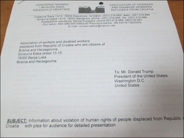 UDRUŽENjE Srba radnika i invalida rada izbeglih i proteranih iz Hrvatske, koje okuplja oko 30.000 članova u BiH, uputilo je pismo Donaldu Trampu, predsedniku SAD.