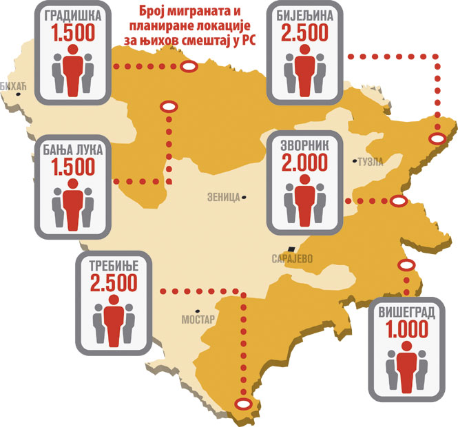Sve više se govori da postoji prećutni plan Saveta ministara da Republika Srpska primi 11.000 migranata. Od toga bi 2.500 otišlo u Bijeljinu i Trebinje, 2.000 u Zvornik, a po 1.500 u Banjaluku i Gradišku, dok bi 1.000 migranata završilo u Višegradu. U Sarajevu se čak pojavila karta i raspored migranata za njihov smeštaj u Republici Srpskoj, saznaju "Novosti" od izvora bliskih Savetu ministara BiH.