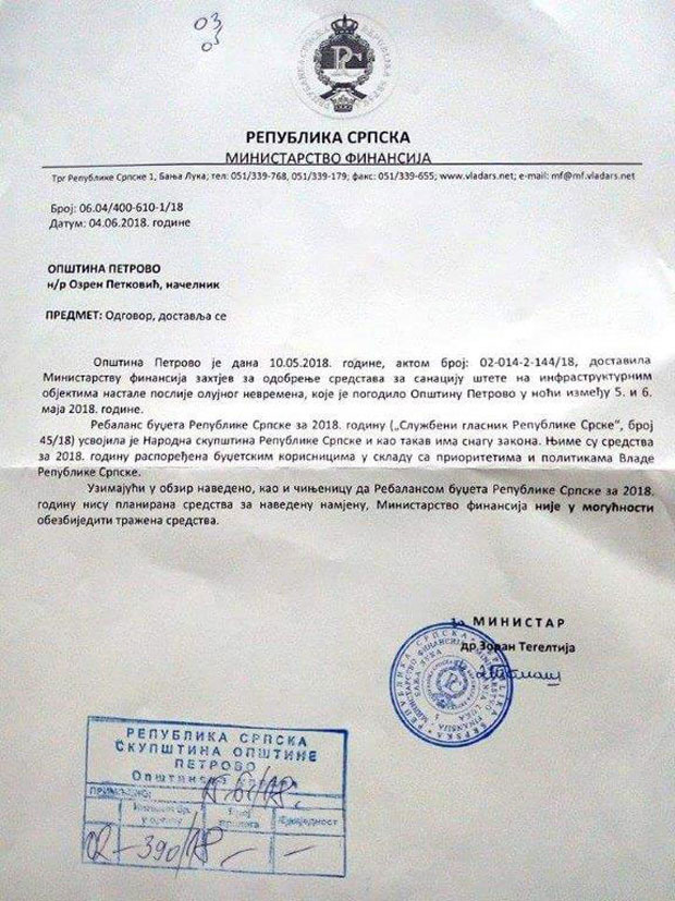 Međutim, tek nakon mesec dana od poplava dobili su odgovor u kojem ih ministar finansija Zoran Tegeltija obaveštava da im ne mogu izaći u susret, jer nemaju predviđenih sredstava za te namene u budžetu niti u njegovom rebalansu za ovu godinu. Iako su i 13. jula u novim vremenskim neprilikama, koje su zahvatile naselja Sočkovac i Kakmuž, pretrpeli takođe ogromnu štetu posebno na infrastrukturi, iz Banjaluke su ostali nemi na apele iz Petrova.