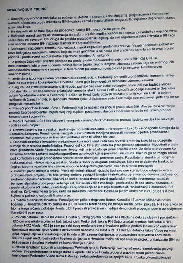 Memorandum BOING, zapravo, je platforma za razvoj bošnjačke unitarističke i centralističke ideje kojom se bh. Hrvati pretvaraju u nacionalnu manjinu.