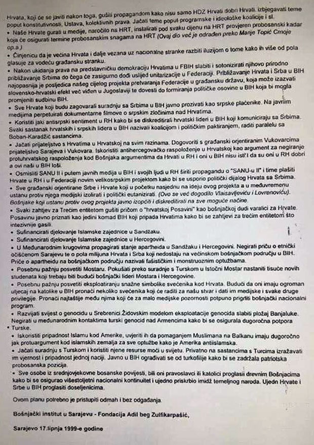 14. Poticati ostanak HDZ-a na vlasti u Hrvatskoj. Zbog grijeha prošlosti RH Vlada na čelu sa slabim i pokajničkim HDZ-om nije nikakva prijetnja bošnjačkoj ideji. Preko Bošnjaka u RH Saboru jačati identitet Bošnjaka u RH i ostanak HDZ Vlade. HDZ je sam po sebi, zbog međunarodno prihvaćene priče o podjeli Bosne, već eutanaziran. Sprečavati dolazak lijeve Vlade s državničkim načelima na vlast u RH. U slučaju dolaska takve Vlade na vlast, jačati neprijateljstvo i nenaklonjenost Hrvatima u BiH prema ideji ljevice, propagandom o povratku komunista. Raširiti svijest među bošnjačkim liderima da ljevica u Hrvatskoj može biti opasnija za projekt unitarizacije BiH od RH desnice i dodatno ih obučiti za komunikaciju s njima.