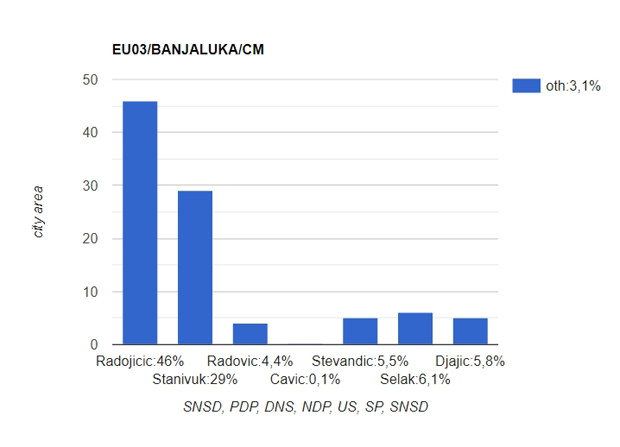 I dok je pad SDS u Banjaluci nešto što ne predstavlja iznenađenje, s obzirom na slabe rezultate proteklih godina, te veliki rast PDP, pad rejtinga DNS je iznenađenje, iako ovu stranku potresaju sukobi, kako unutar partije, tako i unutar koalicije. Ujedinjena Srpska ima priličan rast rejtinga i u novoj konstelaciji koalicionih odnosa približava se mestu među tri vodeće stranke. Socijalisti Petra Đokića imaju stabilnu bazu glasova i rast u odnosu na ranija istraživanja.