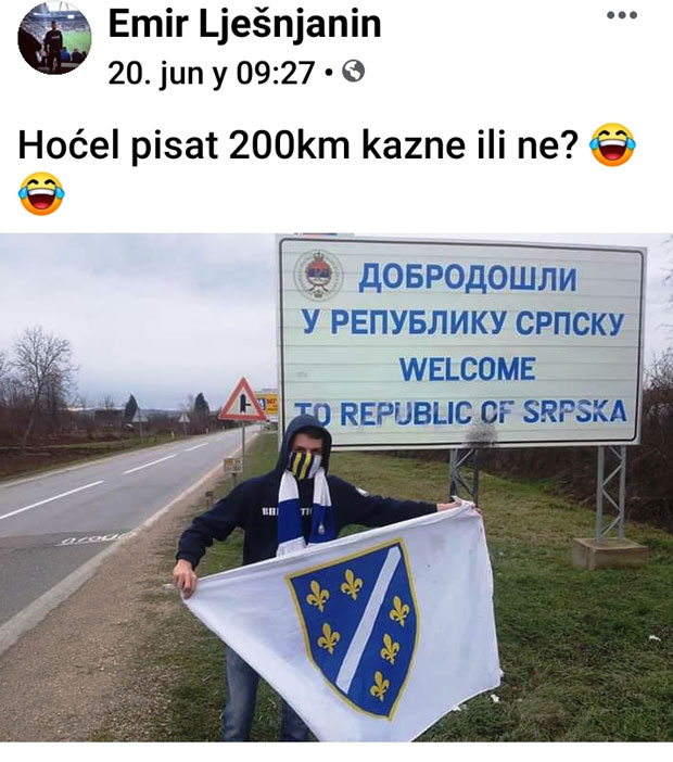 Policijski službenici Policijske stanice Modriča kaznili su Emira Lješnjanina(22) zato što je na društvenoj mreži Fejsbuk objavio vlastitu fotografiju sa ratnom zastavom takozvane Armije BiH