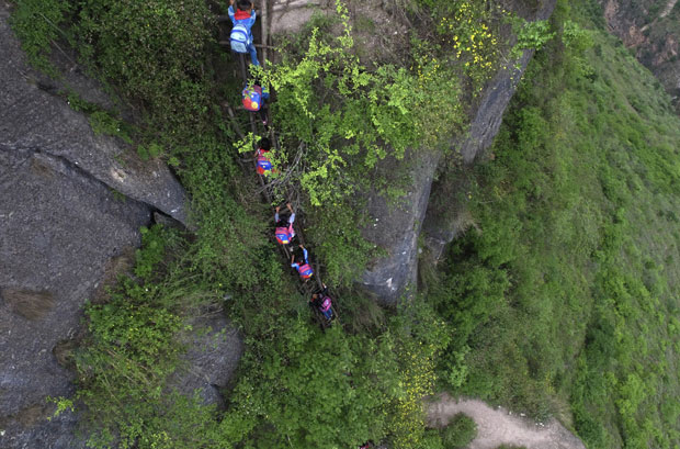 Dramatične fotografije koje su se pojavile u medijima prikazuju decu koja nose šarene rančeve i penju se na 17 odvojenih merdevina u pratnji odraslih. Fotografije su dobile još veću pažnju nakon pojavljivanja na naslovnoj strani na engleskom jeziku China China Daily.