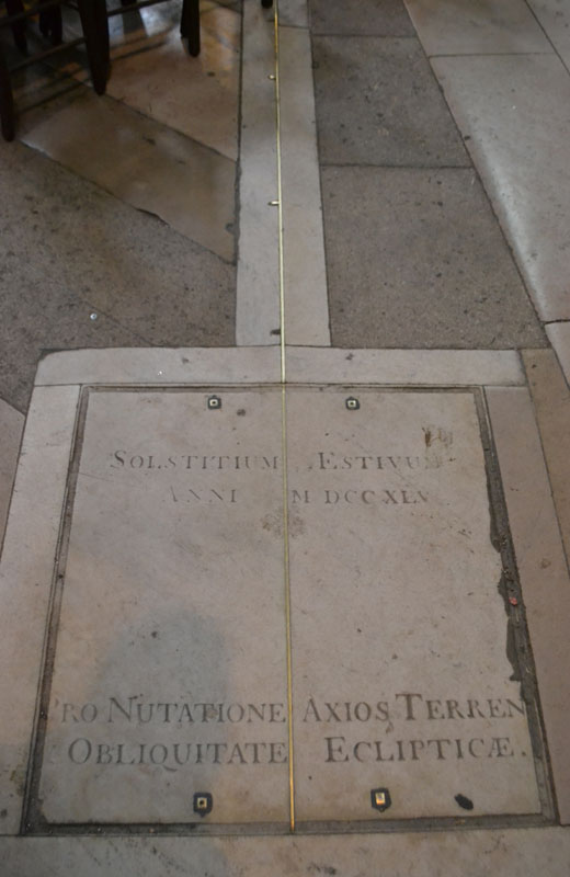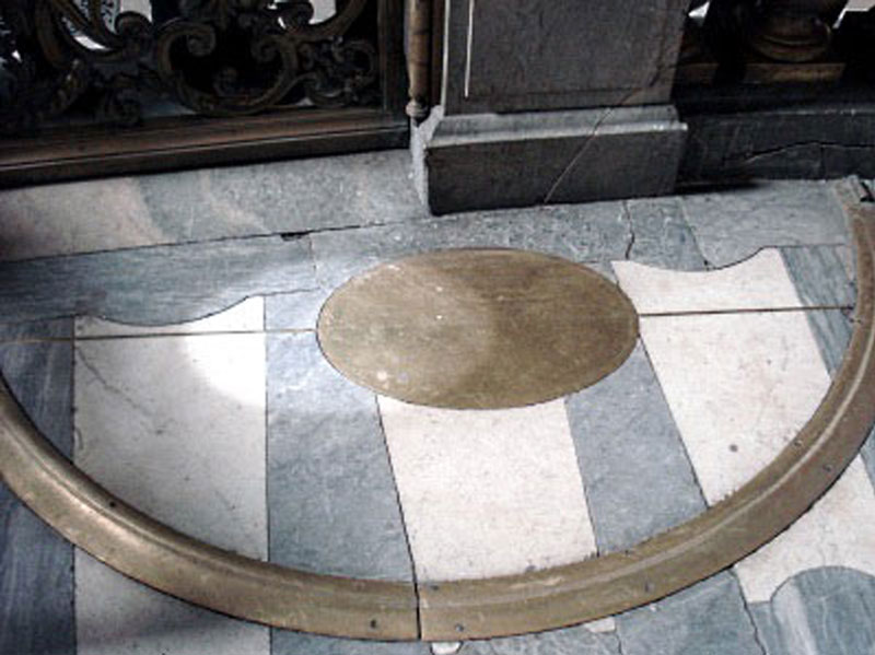 Bakarni meridijan ovog sunčanog časovnika je jedinstven, jer je poprečni presek crkve bio kratak za celu njegovu dužinu, pa je nastavljen na deset metara visokom mermernom obelisku, na kom se ocrtava najkraći dan u godini.