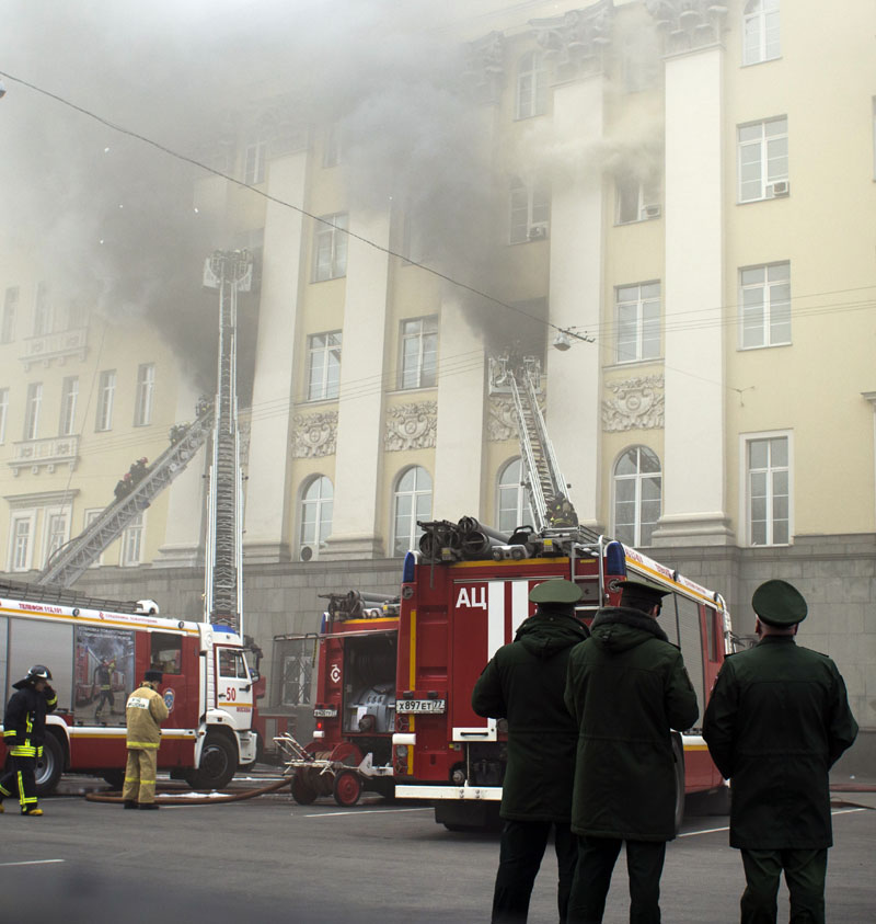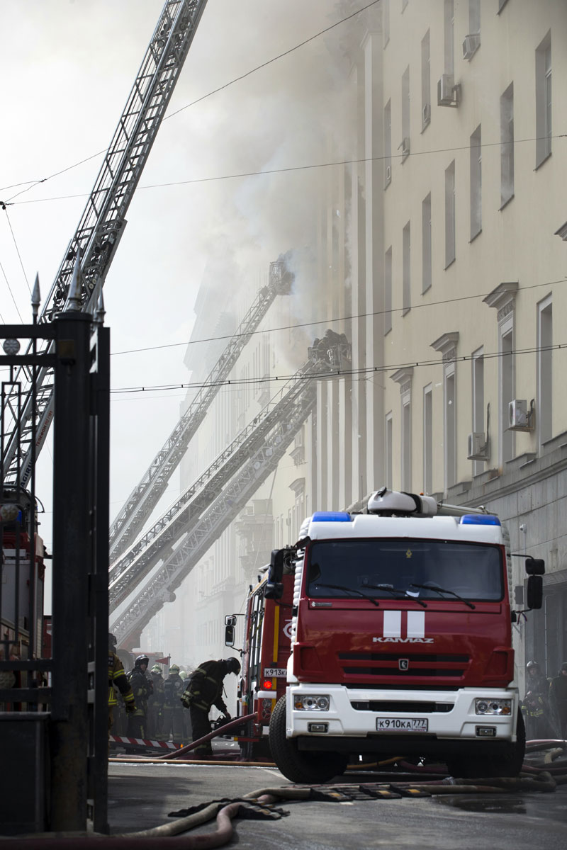 U CENTRU Moskve juče je planuo požar u staroj, administrativnoj zgradi Ministarstva odbrane Rusije u Ulici Znamenka 18, udaljenoj od Kremlja oko 400 metara. Iako su vatrogasci brzo došli, vatra je zahvatila sve spratove i stigla do krova. Požar je najpre lokalizovan, a zatim buknuo ponovo.