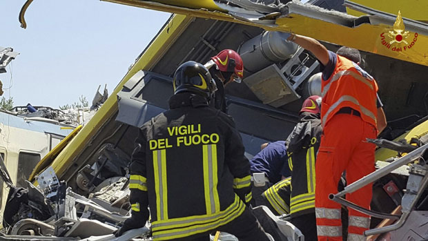 Po rečima zamenika guvernera Pulje, Antonija Nuncijante, "situacija je dramatična, ali spasilačke službe dobro rade svoj posao". Šef lokalne policije Rikardo Cingaro kazao je za list "Republika" da ima mnogo poginulih i da su pojedini vagoni potpuno smrskani. Pošto je čuo vest o nesreći, premijer Italije Mateo Renci prekinuo je govor koji je juče držao u Milanu. On je naglasio da je sudar vozova "trenutak bola" i da istraga neće stati dok se ne utvrde uzroci zbog kojih je do nesreće došlo. Mediji podsećaju da se ove godine u Nemačkoj već dogodila nesreća na jednokolosečnoj pruzi, u kojoj je stradalo 11 ljudi. Istražitelji su potvrdili da je kontrolor greškom istovremeno dozvolio obema kompozicijama da koriste jedini raspoloživi kolosek, pri čemu je isključen automatski sistem bezbednosti. Italijanske vlasti sumnjaju da bi u jučerašnjoj tragediji sličan fatalni potez kontrolora mogao da bude uzrok.