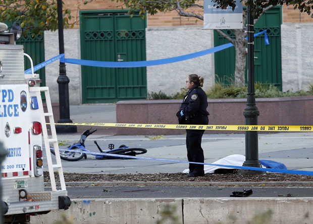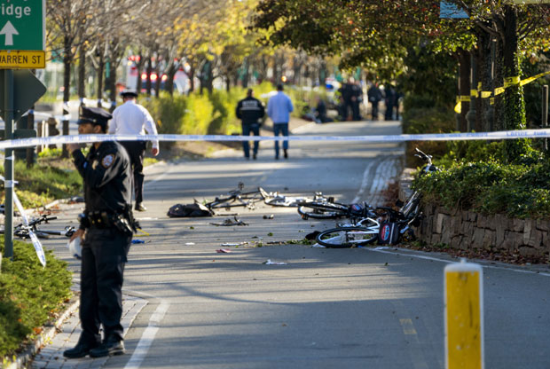 Očevici opisuju haotične scene kada je beli "pik-ap" uleteo i udarao bicikliste na stazi u blizini nekadašnje lokacije Svetskog trgovinskog centra, a onda se zabio u školski autobus.