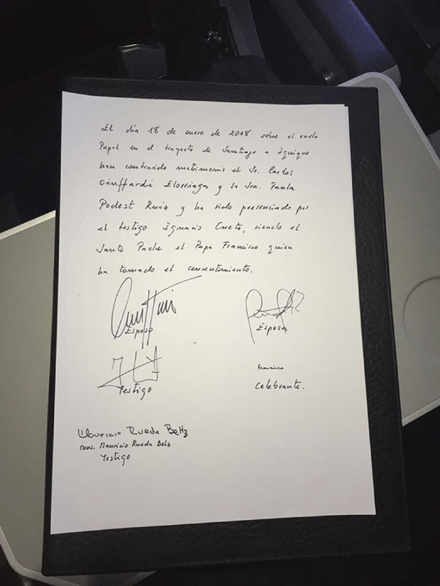 Papa Franja venčao je dva člana posade čilenaske aviokompanije LATAM u papskom avionu na letu iz grada Santijago ka gradu Ikike na severu Čilea.