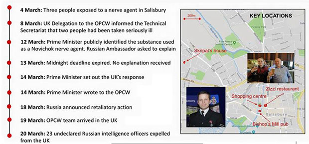 Slajdove sa te prezentacije objavio je moskovski dnevni list "Komersant". Ruski zvaničnici tvrde da ti slajdovi nisu nikakav argument i da nisu nimalo ubedljivi. Na prvom slajdu je naziv prezentacije, na drugom hronologija od 4. do 20. marta i karta sa mestima incidenta, treći je, prema podacima "Komersanta", opis otrovnog agensa, uz navode da je Rusija "bez ikakve sumnje" odgovorna za incident i da "nijedna druga zemlja nije imala istovremeno mogućnosti, nameru i motiv".