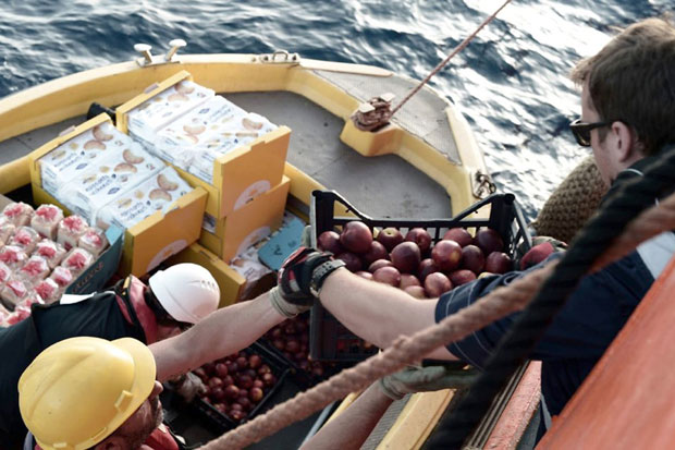 Brod je danas snabdeven sa 950 boca vode, 800 kutija rezanaca i grickalica, pokrivačima, šeširima i čarapama, rekla je humanitarna organizacija.