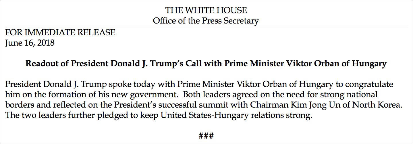 Tramp je mađarskom premijeru čestitao na ponovnom izboru za predsednika vlade, a obojica su se složila sa pozicijom da državne granice treba štititi "jasno i odlučno" i da treba održati dobre američko-mađarske odnose, prenosi Hina.