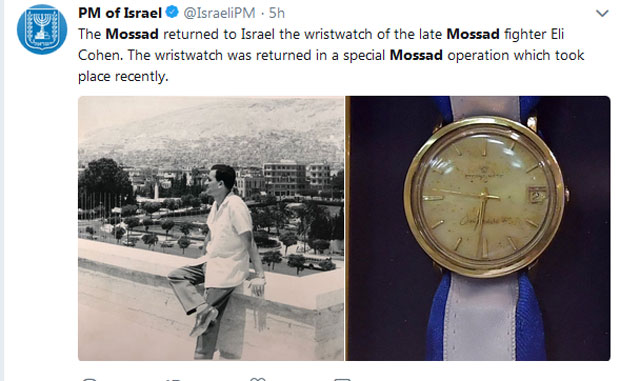 Izrael je danas obelodanio da je obaveštajna agencija Mosad pronašla ručni sat Elija Koena, izraelskog špijuna koji je proglašen nacionalnim herojem, nakon što je pogubljen u Siriji pre 50 godina