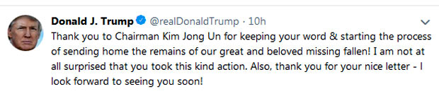 Tramp je kasno sinoć na svom Tviter nalogu zahvalio Kimu za "lepo pismo" i dodao da se raduje skorašnjem susretu, preneo je AP.
