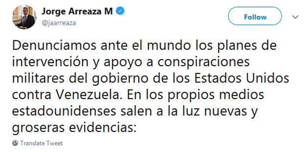 "Osuđujemo planove vlade SAD o intervenciji i njenu podršku vojnim zaverama protiv Venecuele", poručio je ministar Horhe Areaza putem Tvitera, dodavši da čak i u američkim medijima dokazi o tome izlaze na svetlost dana, prenosi Rojters.