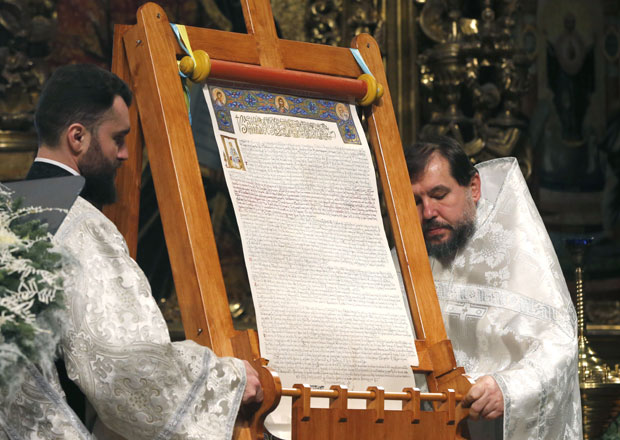 U hramu Svete Sofije u Kijevu 7. januara, na Božić, svečano je obelodanjen tomos kojim je proglašena samostalnost nove raskolničke ukrajinske pravoslavne crkve. Tomos, dekret o autokefalnosti kojim se novoj Pravoslavnoj crkvi Ukrajine dodeljuje nezavisnost u odnosu na Rusku pravoslavnu crkvu su u crkvu zajedno uneli poglavar novoosnovane crkve Epifanije i predsednik Porošenko.