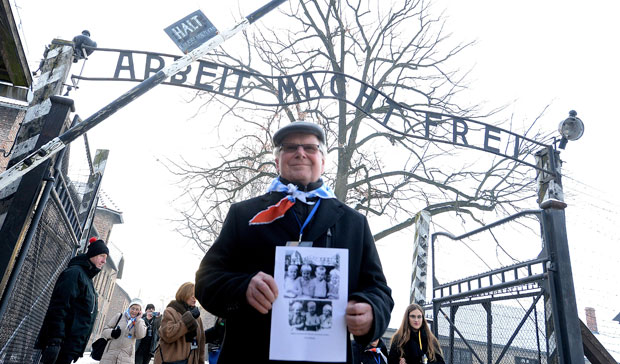 Preživeli bivši zatvorenici nekadašnjeg logora smrti Aušvic, na jugu Poljske, danas su, na Međunarodni dan sećanja na žrtve Holokausta, 27. januar, postavili cveće na Zid smrti