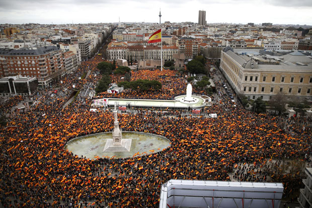 Parole pod kojima je održan protest glasile su - "Za jedinstvenu Španiju" i "Izbori odmah". Na čelu kolone bili su Pablo Kasado, Albert Rivera i Santjago Abaskal, lider tripartitne koalicije koja je smenila s vlasti socijaliste u Andaluziji i sada pokušava da uradi isto na nivou Španije. Aktuelni premijer Pedro Sančez optužen je za izdaju, poniženje i "nož u leđa" Španiji.