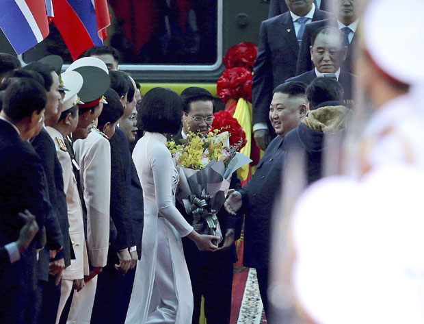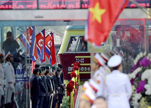 Severnokorejski zvaničnici, koji su ranije otputovali u Vijetnam, uključujući i njegovog visokog zvaničnika za odnose sa SAD Kim Hjok Čola, okupili su se na železničkoj stanici da dočekaju Kima.