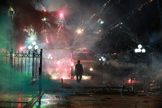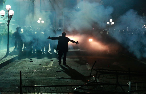 Zatim je Baša poveo pristalice prema zgradi parlamenta, na koji je mala grupa ljudi kamufliranih lica bacala dimne bombe i petarde.