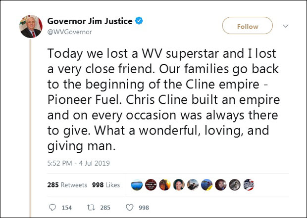 - Kris Klajn je izgradio carstvo i uvek je bio spreman da daje - naveo je guverner Zapadne Virdžinije Džim Džastis na Tviteru.