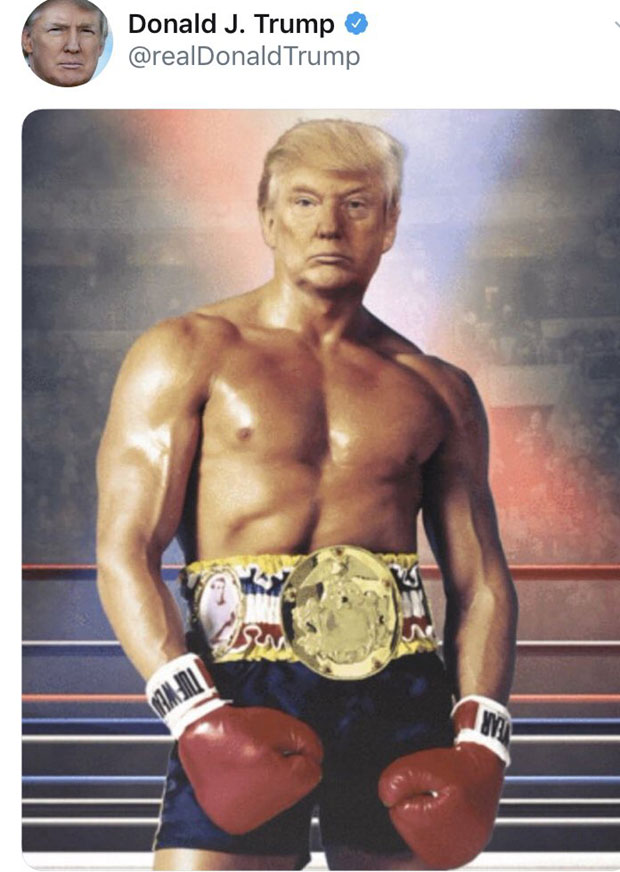 Krajem novembra Trampova glava se tako našla na telu fiktivnog boksera Rokija Balboe, iz čuvenog filma Silvestera Stalonea, a nedavno je osvanula i fotografija predsednika s telom Marvelovog negativca Tanosa iz serijala "Avendžers".