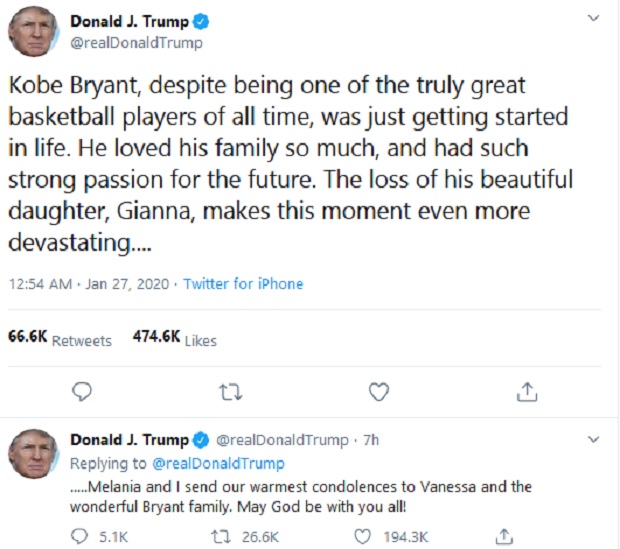 TRAGIČNU smrt legendarnog košarkaša Kobija Brajanta koji je zajedno s 13-godišnjom ćerkom i još sedam ljudi poginuo u pada helikoptera na društvenoj mreži "Tviter" prokomentarisao je i američki predsednik Donald Tramp.