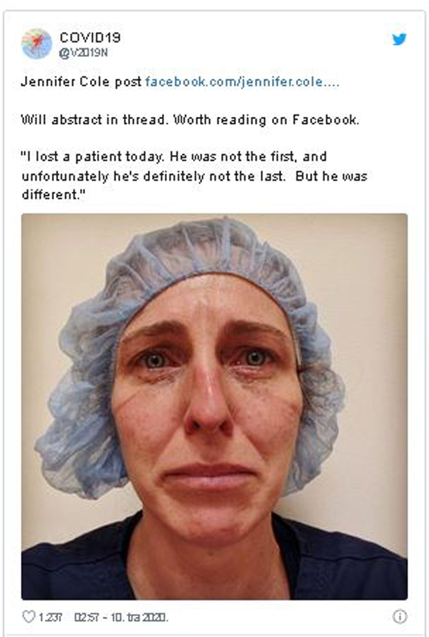 Dženifer Kol, medicinska sestra iz Njujorka, u kom je stanje izuzetno teško, u dirljivom statusu na Fejsbuku opisala je koliko se teško nosi sa smrću pacijenta koji je umro nakon što se tri dana brinula za njega.
