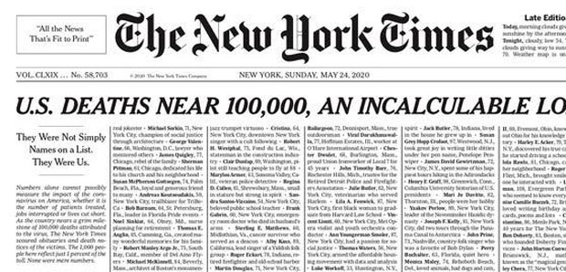 List "Njujork tajms" posvetio je celu naslovnu stranu imenima ljudi koji su umrli od virusa korona, u trenutku kada se u SAD broj umrlih u pandemiji približava 100.000. Imena i kratki opisi prikupljeni iz umrlica iz cele zemlje popunjavaju šest stubaca ispod naslova"Broj umrlih u SAD blizu 100.000, neprocenjiv gubitak" i podnaslova "Oni nisu bili samo imena na spisku, oni su bili mi".Umesto uobičajenih članaka, slika i grafika na naslovnoj strani lista u nedelju se nalazi spisak ljudi koji su izgubili život u pandemiji, u nastojanju da prenese obim i raznolikost izgubljenih života, rekla je Simon Lendon, pomoćnik urednika u rubrici za grafiku.