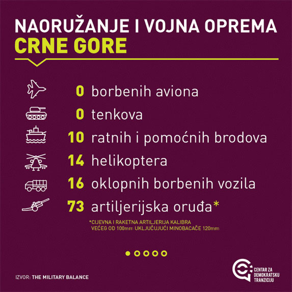 U izveštaju organizacije "Vojna ravnoteža" koja daje globalnu analizu i ocenu vojnih kapaciteta država, našli su se i podaci o naoružanju i vojnoj opremi Crne Gore i zemalja regiona. Po tom dokumentu Crna Gora nema borbene avione i tenkove, ima 14 helikoptera i 16 oklopnih borbenih vozila. Uz to, ima 73 artiljerijska oruđa, u koja se ubraja i cevna i raketna artiljerija kalibra većeg od 100 mm, uključujući minobacače 120 mm. Crnogorci imaju i 10 ratnih i pomoćnih brodova i plovnih sredstava.