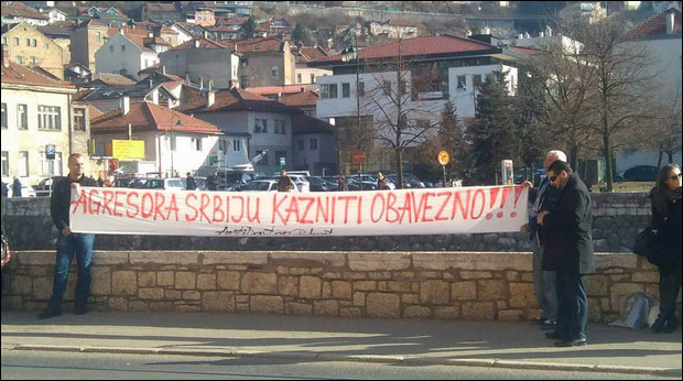 PRILIKOM dolaska zvanica na savetovanje, grupa mladića je razvila transparent prekoputa Većnice. Na njemu je pisalo: "Agresora Srbiju kazniti obavezno!"