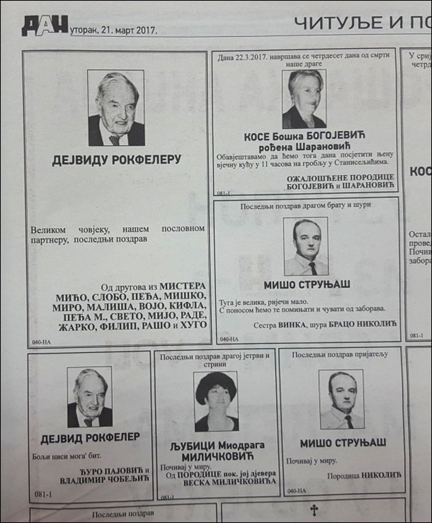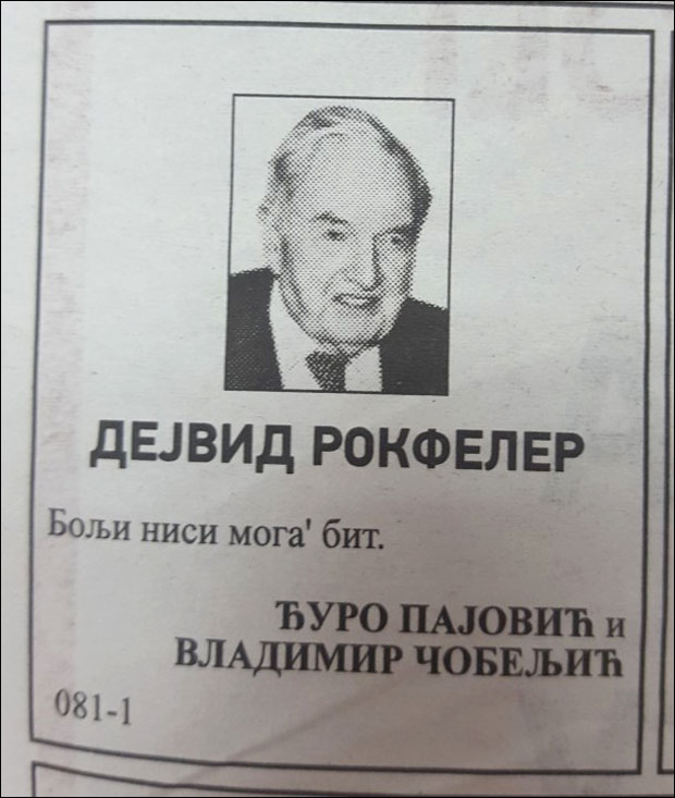 HILjADAMA kilometara daleko od Njujorka i umrlog milijardera Dejvida Rokfelera, Crnogorci oplakuju njegovu smrt u 102. godini. U štampi su se danas pojavile čitulje posvećene američkom bogatašu u kojima podgorički đetići na svoj način iskazuju žalost.