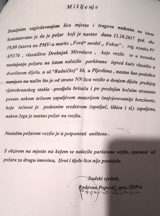 Požar od 11. oktobra ove godine u kojem je izgoreo automobil "ford fokus" Miroslava Drobnjaka, honorarnog dopisnika "Večernjih novosti" iz Pljevalja, namerno je podmetnut, konstatovao je u nalazu Radovan Popović, sudski veštak iz oblasti zaštite od požara, eksplozija i eksplozivnih sredstava.
