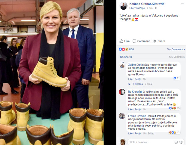Hrvatska predsednica Kolinda Grabar Kitarović posetila je danas fabriku Borovo, koja između ostalog proizvodi "žute zenge", obuću koju su u ratu nosili hrvatski vojnici, a koje je ona imala u koloni tokom obeležavanja godišnjice pada Vukovara.