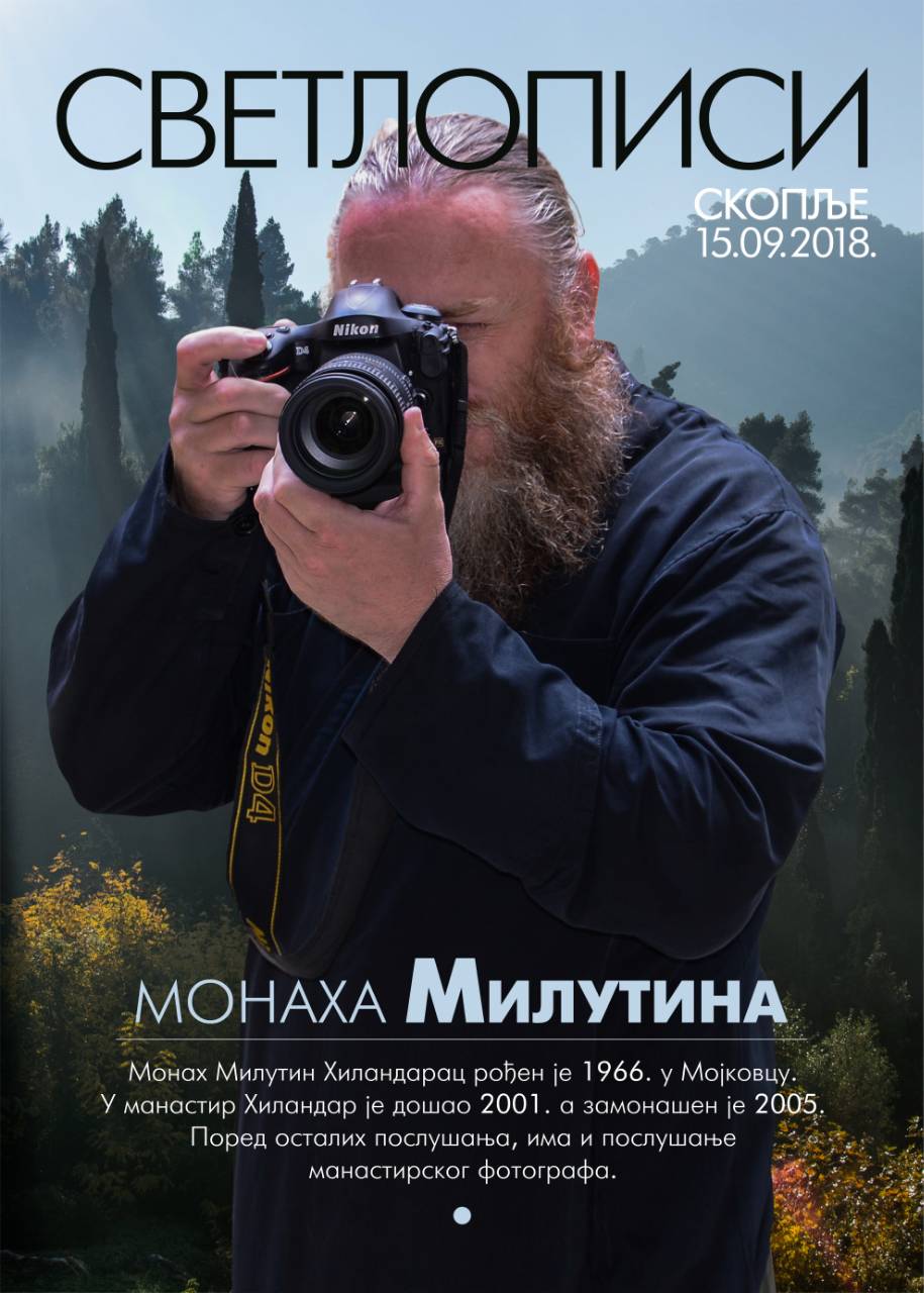 Kako je “Novostima” potvrđeno iz Spone, u 19 časova u Kinoteci Makedonije je predavanje igumana svete srpske carske lavre Hilandara, arhimandrita Metodija na temu “Duhovna iskustva Svete Gore”. Potom u salonu Kinoteke biće otvorena izložba fotografija „Svetlopisi“ monaha Milutina Hilandarca.