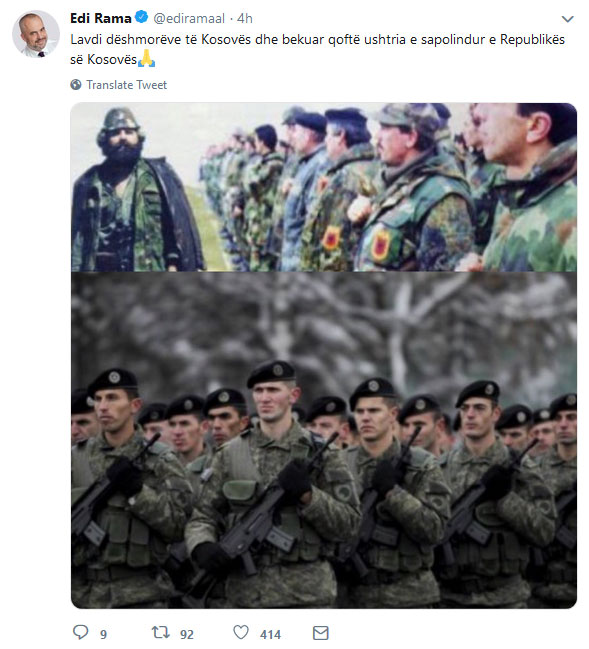 Albanski premijer Edi Rama izrazio je, putem Tvitera, podršku odluci kosovske skupštine o usvajanju vladinih predloga zakona o transformaciji Kosovskih bezbednosnih snaga (KBS) u vojsku