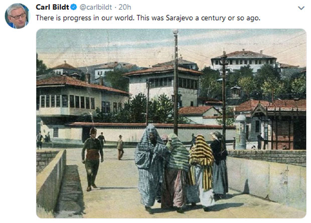 Bilt je na svom tviter nalogu postavio fotografiju Sarajeva na kojoj su žene koje nose burke, sa propratnim komentarom: "Postoji napredak u našem svetu. To je bilo Sarajevo pre jednog veka".