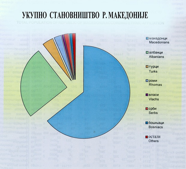 BROJKEPREMA popisu iz 2002. u ukupnoj strukturi stanovništva u Makedoniji – od 2.022.547 žitelja 64,2 odsto su Makedonci, a 25,17 Albanci, potom 3,85 Turci, 2,66 Romi, 1,78 procenata Srbi...
