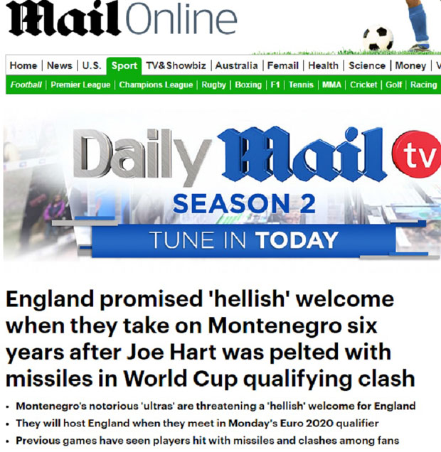 U tekstu „Crnogorski navijači prete ‘paklenom’ dobrodošlicom Engleskoj“, navodi se da se očekuje snažno prisustvo policije uoči dolaska engleskih navijača u Podgoricu u subotu, kada su građanski protesti, prenosi portal IN4S.