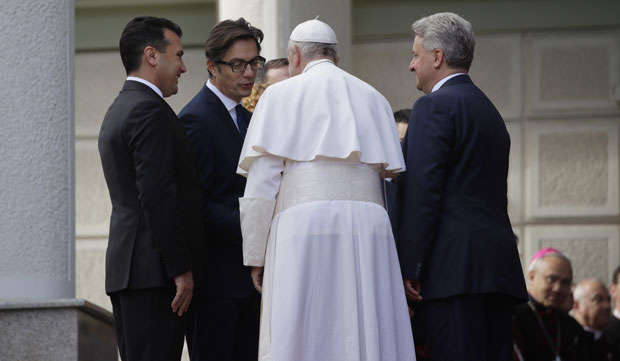Posle svečanog dočeka na skopskom aerodromu, hlebom i solju, papu su u rezidencijalnoj predsedničkoj vili, na brdu Vodno iznad Skoplja, primili odlazeći šef države Đorđe Ivanov i premijer Vlade RSM Zoraljn Zaev. Njima je gost rekao da su ta velika kulturna bogatstva izraz neprocenjivog nasleđa zemlje i njenog multietničnog i multireligijskog naroda, bogate istorije i njihovih vekovnih odnosa.